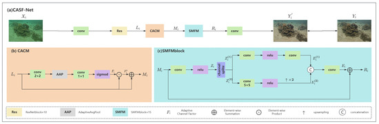 Finally, a convolution is applied to obtain the output image . The proposed CACM module enhances the feature extraction and color correction functions to solve the problem of insufficient contrast, while the SMFM module uses spatial information to capture multi-scale receptive fields for feature fusion to solve the problem of distortion of surface texture and effectively improve the saturation of underwater images.