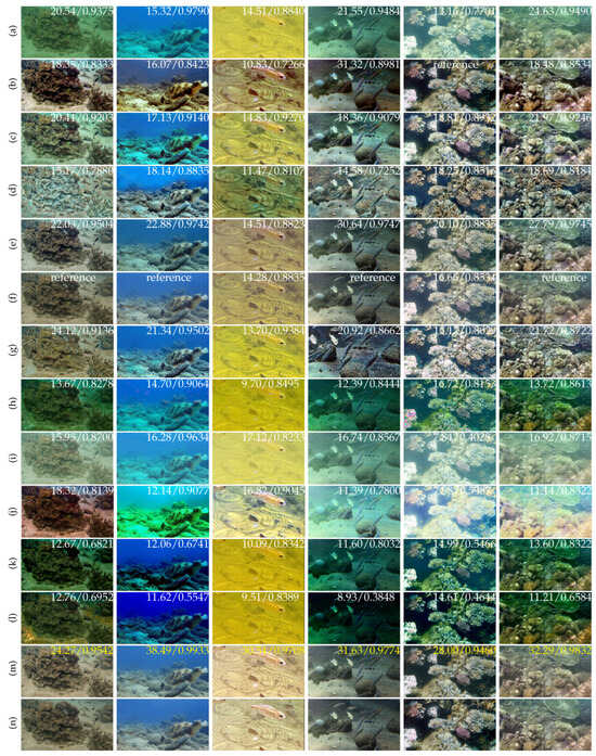 - Evaluation metrics. For the test dataset with reference images, we conducted a full-reference evaluation using the PSNR [47] and SSIM [48] metrics. These two metrics reflect the degree of similarity to the reference, where a higher PSNR [47] value indicates closer image content, and a higher SSIM [48] value reflects a more similar structure and texture.