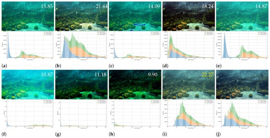 Comparison chart of three-channel color histograms. 22.27 represents the PSNR values, and the yellow font indicates the highest values. (a) Raw image. (b) CLUIE [18]. (c) DCP [10]. (d) FspiralGAN [15]. (e) GC [19]. (f) GDCP [20]. (g) MSCNN [16]. (h) UDCP [9]. (i) Ours. (j) Ground truth.