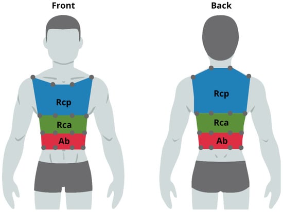 To collect tridimensional kinematic data, we used twelve OptiTrack Prime 17 W cameras (NaturalPoint, Corvallis, OR, USA) with an acquisition frequency of 360 Hz, autofocus, a wide-angle (FOV) of 70°, a resolution of 1.7 megapixels, and an accuracy better than 1 mm [20]. The markers used have a spherical shape because this shape allows for better reflection of the infrared rays emitted by the cameras. The markers chosen for this application are passive, which has the advantage of being cable-free and reducing clutter in the test environment. They provide greater freedom of movement for the tested subjects and do not require any additional information exchange with the system’s core before being used. A hypoallergenic adhesive layer is placed under the base of the markers, and they are placed directly in contact with the subject’s skin. The protocol, composed of 32 markers for respiratory biomechanics, was chosen to divide the thoracic cage into three compartments (RCp, RCa, and AB). Each compartment is further divided into three sub-volumes according to the studies by Ferrigno et al. [11] (Figure 1). This protocol divides the chest wall into four horizontal lines (at the level of second rib, xiphoid process, tenth rib, and abdominal transversal line) and four vertical lines equally spaced from the midline, between the anterior axillary line and the mid-axillary line, positioned on the anterior and posterior regions of the trunk. The RCp reflects the action of the neck and parasternal muscles, as well as pleural pressure; the RCa reflects the action of the diaphragm, along with pleural and intra-abdominal pressures; and the AB reflects the action of the diaphragm and abdominal muscles. Markers’ trajectories were reconstructed using the software Motive® Optitrack Software v.2.1 (NaturalPoint, Corvallis, OR, USA) and exported as .csv format.