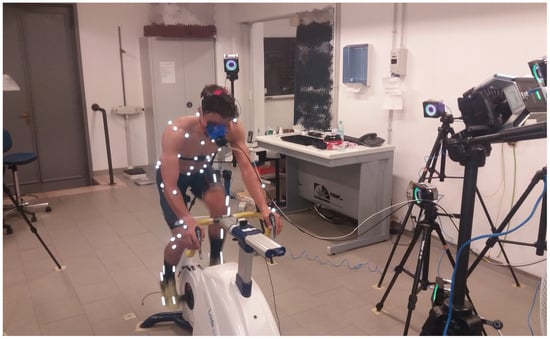 Fourteen well-trained male cyclists (age 23 ± 4 years, body mass 63 ± 7 kg, height 1.73 ± 0.07 m, body mass index 21.1 ± 1.8 m·kg−2), with a minimum of 400 km of training per week, volunteered to participate in the study. They performed a step incremental test on a cycle-ergometer to assess the performance of the MoCap system during cycling exercise as detailed below (see Figure 2). The performance of the MoCap system was also assessed at rest during quiet breathing, and seven untrained male volunteers (age 27 ± 3 years, body mass 71 ± 12 kg, height 1.75 ± 0.06 m, body mass index 23.2 ± 2.5 m·kg−2) were recruited for this purpose.