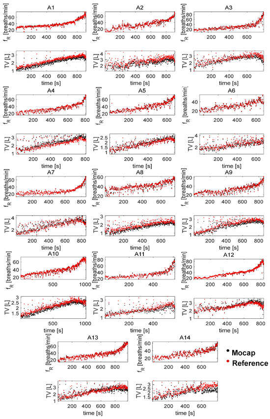 Figure 3. Time course of f R and V T breath-by-breath values for all 14 athletes analyzed during the incremental test. In black are the MoCap data, while in red are the reference values.