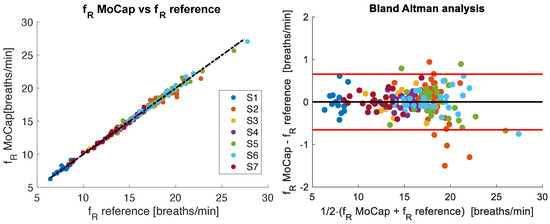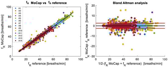 Figure 8. The (left) panel shows the correlation of breath-by-breath f R values between reference and MoCap systems for all seven untrained volunteers analyzed during quiet breathing. The Bland–Altman plot of the breath-by-breath f R values is depicted in the (right) panel. The black line represents the mean difference (MOD), while the red lines indicate ±1.96 standard deviations (LOAs).