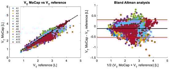 Figure 5. The (left) panel shows the correlation of breath-by-breath V T values between reference and MoCap systems for all 14 subjects analyzed during the incremental test. The Bland–Altman plot of the breath-by-breath V T values is depicted in the (right) panel. The black line represents the mean difference (MOD), while the red lines indicate ±1.96 standard deviations (LOAs).
