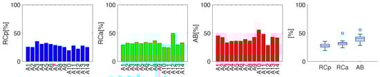 The average percentage contributions (i.e., % R C p , % R C a , % A B ) over the entire test were calculated using the following formula: