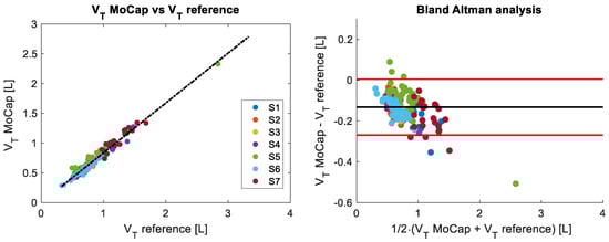 Figure 9. The (left) panel shows the correlation of breath-by-breath V T values between reference and MoCap systems for all seven untrained volunteers analyzed during quiet breathing. The Bland–Altman plot of the breath-by-breath V T values is depicted in the (right) panel. The black line represents the MOD, while the red lines the LOAs.