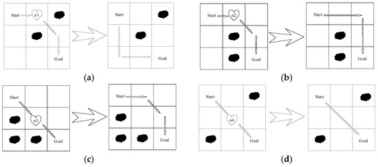- As shown in Figure 2a,c, let the subnode be . If the obstacle is located at or , then , , or , , are removed;