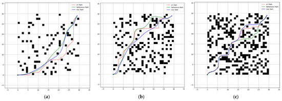 To visually demonstrate the improvements in the heuristic function, neighborhood search strategy, and curve smoothing of the traditional A* algorithm, this section employs Matplotlib (version 3.10.1) to visualize the path planning results. Three simulation experiments were conducted on 30 × 30 grid maps with obstacle densities of 10%, 20%, and 30%, as shown in Figure 3a–c. In these figures, the green solid circle and blue cross represent the start and end points, respectively; the red dashed line indicates the path generated by the original A* algorithm; the green solid line represents the improved A* algorithm from the reference [24]—using 4-neighborhood search and second-order Bézier curve smoothing; and the blue solid line shows our improved A* algorithm. Black squares denote obstacles sized 1 × 1.