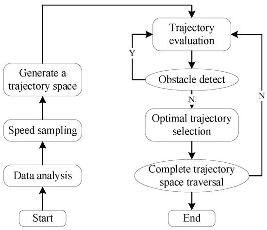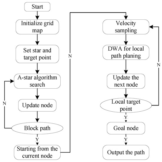 The coefficient is a weighting function that adjusts the importance of each factor through weighted summation; the evaluation function measures the robot’s forward speed toward the target; the evaluation function quantifies the minimum distance between the trajectory and obstacles, ensuring effective obstacle avoidance; and the evaluation function assesses whether the robot’s dynamic constraints are satisfied, such as the limits on maximum speed and maximum acceleration. The key global path points generated by the A* algorithm can be incorporated into the DWA algorithm as guiding points for local path planning. This integration ensures a balance between global optimality and local obstacle avoidance capability [25]. The flowchart of the hybrid algorithm is shown in Figure 5, illustrating the entire process from global path planning to local obstacle avoidance.
