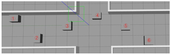 This is the gazebo world of the simulated environment. The green box and blue line represent the central coordinate of the environmental map, the numbers represent the serial numbers of the six obstacles.