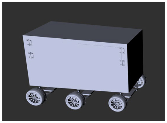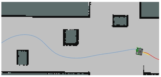 During the experiments, the mobile robot dynamically acquired data from the simulated corridor and sidewalk, avoided pre-placed obstacles, and followed a predefined path to reach target points [31]. The simulation model of the mobile robot and LiDAR was created using a URDF file, as shown in Figure 9.