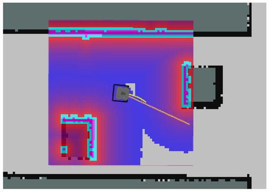 The local costmap is a real-time generated local map based on sensor data such as LiDAR and cameras, used to reflect the distribution of obstacles around the robot. In the simulation environment, the dark blue block area represents the maximum scanning range covered by the odometry, which dynamically updates as the robot moves. The orange lines represent the globally optimal path generated by the DWA algorithm in the local planner, while the yellow lines indicate the locally optimal path generated by the local planner. A schematic of the local costmap is shown in Figure 11.