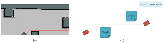 As shown in Table 1, with the improved heuristic function, while maintaining the same number of path nodes, the number of nodes traversed was reduced by 22.78%, 9.93%, and 13.49%, respectively; the total cost was reduced by 22.89%, 8.41%, and 8.90%, respectively; the number of turning points was reduced by 11.26%, 12.96%, and 19.85%, respectively; and the running time was reduced by 20.49%, 27.60%, and 28.04%, respectively. These improvements in the A* algorithm’s computational metrics significantly enhance its operational efficiency and speed.