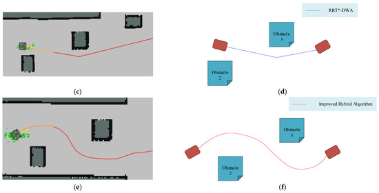 The core of implementing the local path planning functionality lies in dynamically adjusting the path to cope with interference from local obstacles. When the robot detects new obstacles, the current path is corrected, and a feasible path is regenerated. In this experiment, the local planner divides the planning process into multiple time modules. Based on the dynamic constraints of the robot and obstacle constraints, it generates a set of trajectory paths that satisfy the conditions. The improved path planning method generates paths that meet nonholonomic constraints by considering the kinematic characteristics of the robot. Figure 13 shows the results of the path planning comparison experiments. By comparing the improved fusion algorithm proposed in this paper with the traditional algorithm and the RRT*-DWA fusion algorithm, the superiority of our approach in path planning is demonstrated more intuitively. Specifically, Figure 13a,c,e displays the paths generated by the traditional A* algorithm, the RRT*-DWA fusion algorithm, and our improved fusion algorithm, respectively; Figure 13b,d,f presents schematic diagrams of the corresponding paths when encountering obstacles 2 and 3. Comparative analysis indicates that the traditional A* algorithm tends to overlook the minimum safety distance between the robot and obstacles during path planning, increasing the risk of collision. In practical operation, the robot may enter critical areas near obstacles where it fails to find an optimal path, forcing it to backtrack and re-search. Furthermore, when new obstacles appear in the path, the robot may rotate in place and enter a delayed decision-making state, failing to respond accurately in time. This leads to reduced speed and delayed turning maneuvers.