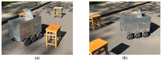 For the outdoor experiment, the robot’s chassis system ran on the Ubuntu 20.04 operating system with Noetic-ROS and was equipped with a 2D LiDAR module to implement 2D laser SLAM mapping using the Cartographer algorithm. In the Noetic-ROS interface, navigation target points were set using the 2D Nav Goal feature in RViz. The experimental scenario simulated the actual environment of the road intersection near the Linji Building at the Xinzhuang Campus of Nanjing Forestry University. Commands were sent from the upper computer to enable the robot to autonomously complete on-site testing. In the field test, the robot encountered three obstacles sequentially and adjusted its orientation and pose during navigation to avoid them, as shown in Figure 14a,b.