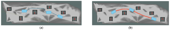 During the test, the LiDAR collected environmental data to construct the map. The 2D laser SLAM environment and mapping results are shown in Figure 15. The robot system successfully built an environmental map of the intersection area. The visualized trajectory diagrams of the robot’s navigation routes using the traditional A* algorithm and the improved algorithm are shown in Figure 15a,b, respectively. The system achieved a mapping and localization accuracy of approximately 0.7 m, with a stable operational frame rate of 26–30 FPS. Although mapping and navigation in outdoor environments introduced some errors and delays compared to indoor settings, these issues had minimal impact on the mapping results for short-path generation.