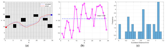 Analysis graphs: (a) Trajectory comparison; (b) Error analysis, red cell represents the euclidean distance error of path points; (c) Error distribution, blue cell represents the occurrence frequency of the euclidean distance error.
