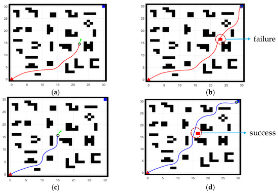 To verify the effectiveness of the proposed algorithm in a highly dynamic environment, where obstacles change rapidly, and to discuss its characteristics and advantages compared to existing research algorithms, experiments were conducted using a reference algorithm [34] and our improved algorithm. The experimental environment was a 30 × 30 grid with multiple obstacles distributed throughout, as shown in Figure 17. In the figure, the red upward-pointing triangle indicates the starting point, the blue square represents the target point, and the green fan-shaped area shows the region being searched by the robot. The red solid line denotes the trajectory produced by the reference algorithm, while the blue solid line represents the trajectory produced by our algorithm. Figure 17a,c illustrates the search states during path planning for the reference algorithm and our algorithm, respectively. In these search processes, the planning strategies are different, with each algorithm proceeding along its respective search direction. Figure 17b,d depicts the complete search paths generated by the two algorithms.