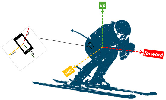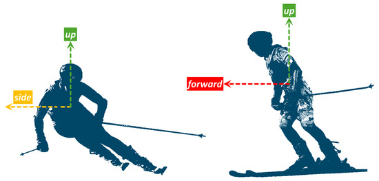 To track skiers’ motions, we introduce the Skier Fixed Reference Frame (SFRF), Figure 2, which has three axes: up, forward, and side. In the SFRF, the up vector is aligned but reversed to the gravity vector and points up, the forward vector is aligned with the direction of movement, and the side vector is pointing from the CoM to the side of the subject. Thinking of the anatomical plane coordinate systems, the side, forward, and up coordinates align with the right, anterior, and superior, respectively. This reference system is aligned with the orientation of an imaginary sensor attached to the CoM. As already discussed in the literature [18], having a sensor located on the pelvis near the CoM allows us to detect and analyze skiing turns.