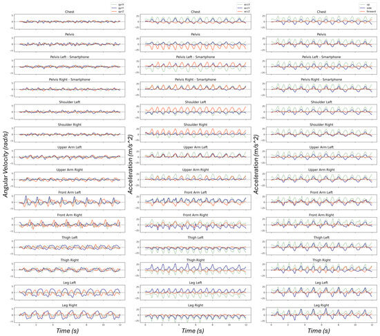 The sensor fusion algorithm first combines raw accelerometer, gyroscope, and magnetometer measurements from each sensor independently to compute rotation quaternions instantaneously. Applying rotation quaternions to the raw 3D acceleration transforms acceleration from the sensor frame to the world reference frame, explained in Section 4.1, which aligns the Y-axis with the direction of gravity. The preprocessing algorithm then applies a wavelet transform on the X- and Z-axes to identify the signal with the highest power, which represents the side direction and is used for turn detection. To compare rotated signals to the raw signals and the ground truth, we segmented signals into 12 s, equal to the shortest activity in the dataset.