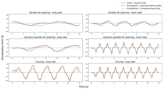 Correlation: It is worth noting that the outcome of the preprocessing algorithm does not necessarily match the captured signals from the chest or any other sensor near the CoM since every body part may contribute extra acceleration. The sensors attached to the legs and arms display such an effect adequately as they experience different dynamics than the trunk. Additionally, side motion is an estimation of the body pose by fusing accelerometers, gyroscopes, and magnetometers. Therefore, the quality of sensors will impact the final result, e.g., front arms introduce more noise. In other words, the preprocessing algorithm brings the signals from any arbitrary location to the same coordinate as the CoM. Also, there might be a little bit of shift as the entire body does not tilt at the same time to produce a turn, which is more visible in techniques performed with longer radii or lower speeds, such as parallel steering—long. Moreover, smartphone sensors have a different quality than the Xsens sensors and are manually synchronized with the other Xsens sensors. Therefore, any of these parameters can hurt the correlation result. These may explain discrepancies among sensors in the correlation analysis. However, the smartphone with the worst correlation is depicted in Figure 7.
