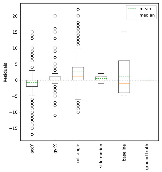 Figure 9 illustrates the box-plot of the residuals using each approach. The results show that the side motion, regardless of the skier, sensor location, and technique, consistently produces a precise number of detected turns with small inter-quartile ranges (IQRs) and a mean close to zero, very similar to the median of residuals. On the other hand, the box-plot for the number of detected turns from other signals displays large inter-quartile ranges (IQRs) (except gyrX), including significant outliers, which indicates inconsistency. The inaccurate turn detection results are due to varied turn patterns captured by dissimilar sensors, as seen in Figure 5.