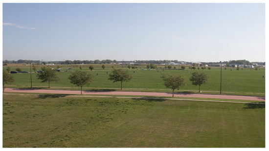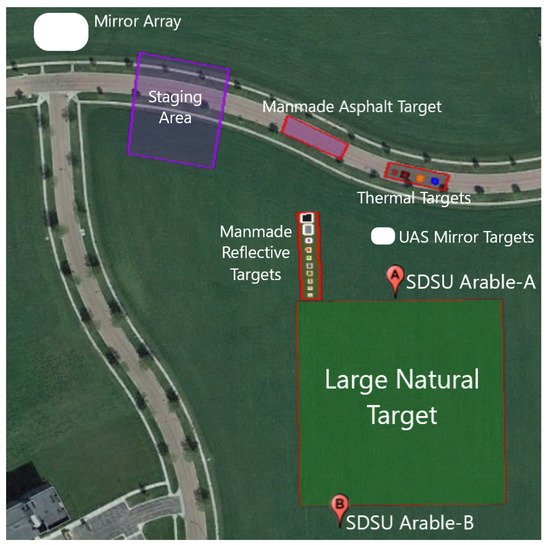 To address this problem, USGS EROS conducted a multi-agency field campaign (titled BigMAC) during 30 August–3 September 2021 in Brookings, SD, USA, at the Research Park for SDSU. This 125-acre facility has large uniform regions of alfalfa that provide a natural vegetative background target along with asphalt roads for a common human-made target. In addition, a number of small panels were deployed with a variety of reflectance and spectral signatures, as well as several thermal targets. Figure 1 shows the site, while Figure 2 shows a pictorial layout of the various targets.