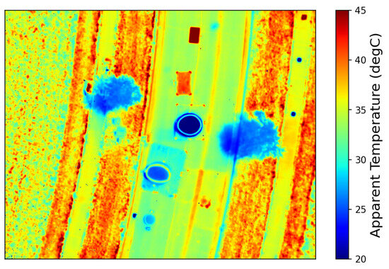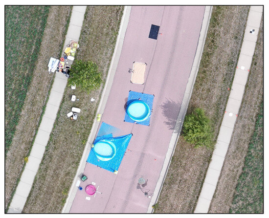 In addition to the UAS sensors, RIT also fielded several ground-based instruments for measuring surface temperature. Chief among these was a FTIR spectroradiometer, called the FTIR (developed by Designs & Prototypes). The FTIR is designed to collect spectral measurements from 2 to 16 µm at a resolution of 6 cm−1, and it has a measured noise equivalent delta temperature () of less than 0.3 °C. The Hobo MX2204 TidbiT water temperature logger was used in the thermal pool targets [22]. These small units have an advertised accuracy of ±0.2 °C over the operational range of 0–70 °C.