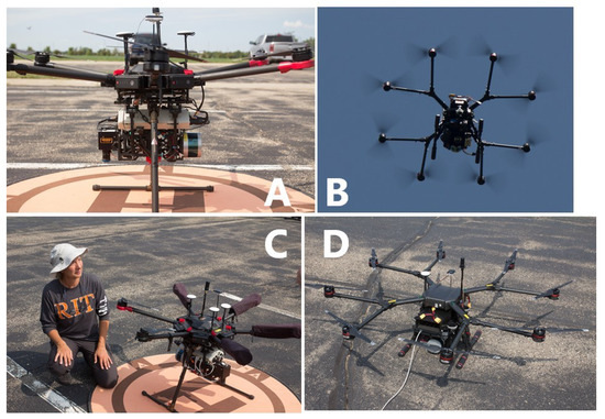 As part of the BigMAC, RIT flew four unique UAS as follows: the MX-1, SWIR, MX-2, and DJI Mavic 2 Enterprise. The MX-1 is a multi-modal sensor payload that simultaneously captures Nano hyperspectral (400–1000 nm), uncooled thermal, three-band color, and five-band multispectral imagery, as well as LiDAR and GPS/IMU data; see Figure 5A,C [19,20]. The SWIR payload was also flown in order to extend the spectral range out to 2500 nm. The MX-1 and SWIR sensor payloads were flown on two separate DJI Matrice 600 Pro UAS platforms in tandem. The MX-2 payload consists of the same capabilities as MX-1 with the following two critical upgrades: a calibrated cooled thermal FLIR A6751sc SLS imaging system and an UAS platform with more lifting power, the DJI Wind 8; see Figure 5B,D. Finally, a DJI Mavic, with a high spatial resolution RGB camera was flown in order to produce an overall basemap of the entire site.