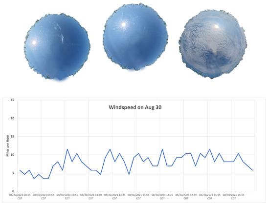Temperatures on 31 August were once again around 70 °F, with a maximum temperature of 78 °F. Cloud cover on 31 August 2021, remained clear throughout the majority of the field collection periods, as shown in Figure 8. Small cumulus clouds began to develop during the final field collection period, as shown in the top right image of Figure 8. Winds were higher throughout the day, with winds of 12 mph at the start of the 10:00 AM field collection period, continuing to increase throughout the hour. The 12:00 PM field collection period winds varied from 15 mph to 20 mph. Therefore, it was decided that the UAS would not be used at the final 2:00 PM collection time. While there was a very brief moment of the winds dropping below 15 mph from 2:00 PM–3:00 PM, winds remained at 15 mph–20 mph throughout the rest of the hour.