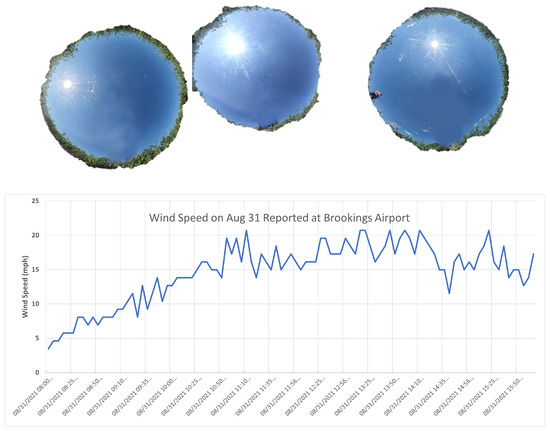 Weather conditions on 31 August 2021. All-sky photos are shown for approximately 10:30 AM (15:30 UTC), 12:30 PM (17:30 UTC), and 2:30 PM (19:30 UTC), respectively. A timeline of the wind speed recorded by the the Brookings, SD airport ASOS station is shown in the lower figure.