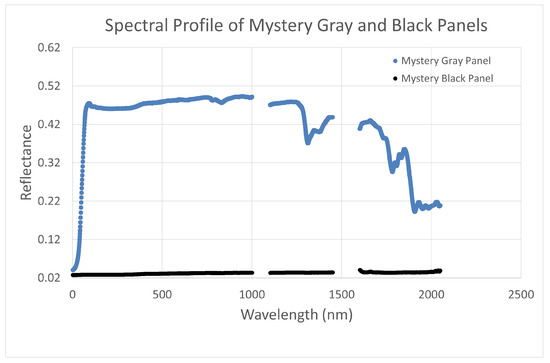 Pertinent to the reflective portion of this campaign were two Headwall sensors—the Headwall Nano and Headwall SWIR M384 sensor—which, together, cover from 400 to 2500 nm in 2.2 nm and 10 nm increments, respectively [19]. The two UAS platforms flew parallel flight lines at 200 ft AGL, capturing the entire site shown in Figure 2. Image and GPS/IMU data were processed and georectified at RIT, the WGS84 coordinate system was used as the geodetic reference, and AeroPoint ground control points (GCPs) were employed for geometric correction to ensure the accurate georeferencing and spatial alignment of the imagery. Then, the UAS images were sent to SDSU for radiometric calibration, target extraction, and surface reflectance estimation for all targets. Radiometric calibration of the imagery was performed using the SDSU-measured reflectance of the Labsphere Permaflect panels to perform an empirical line-based calibration [21].