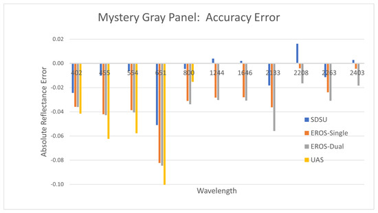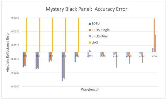 Table 8, Table 9 and Table 10 provide the results for the SWIR2 band. For this band, there is repeatability for individual systems and bright targets from to 0.02, while for dark targets the repeatability is from to 0.002. Across all teams, the repeatability is the same as for individuals. That is, it does not matter if only one instrument/operator combination or multiple instrument/operators are available because the repeatability is essentially the same. Unfortunately, the UAS surface reflectance measurements in the SWIR2 band experienced difficulties. The small human-made targets only provided a few pixels resulting in large uncertainties in those measurement extractions (indicated by the asterisks in Table 10). UAS hyperspectral data were acquired using two separate optical systems. Due to the SWIR system’s larger GSD, nearly twice that of the VNIR system, extracting SWIR channel data from UAS imagery was difficult and unreliable. Therefore, UAS SWIR channel data for the mystery panels were omitted from the analysis. Interestingly, the Permaflect targets were somewhat larger and reflectance estimates from them were quite reliable. In fact, they were quite similar to the ASD estimates.