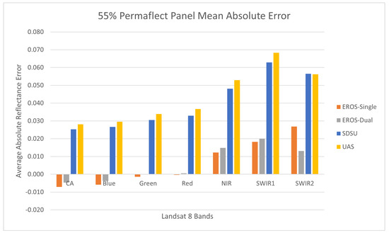 Table 5, Table 6 and Table 7 show the repeatability results for the NIR band. In the case of this spectral band, the bright targets were the same, except the RIT Red target replaced the asphalt target for a range of reflectance from 0.38 to 0.53. Only three really dark targets existed for this band—Permaflect 5%, RIT 2%, and Mystery Black. For the individual ASD system, bright (0.4 to 0.6 reflectance) target repeatability is 0.014–0.020 and darker (0.02 to 0.06 reflectance) target repeatability is 0.001–0.002 . From Table 6, results across all ASD systems indicate repeatability for bright targets from to 0.02 and for darker targets . The results for the UAS indicate that brighter target average reflectance values were quite consistent with the ASD values. However, bright target repeatability ranged from 0.01 to 0.04. In comparison to all ASD teams, bright target uncertainty (standard deviation) is almost double for the UAS but is very similar if the Mystery Gray target is removed. Dark target average reflectance measurements were quite different than ASD values, and dark target repeatability was also larger as follows: 0.005 versus 0.001. Interestingly, repeatability was the highest for the Permaflect target.