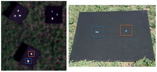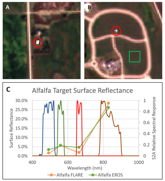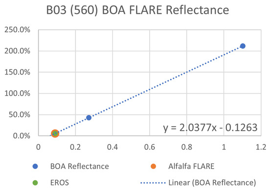 A common approach in the vicarious calibration of Earth Observing systems is the ELM [21,27,28]. Two or more targets of known radiance (or reflectance) are presented to a sensor under test and the sensor’s response is assessed. By performing regression against multiple radiance levels, a calibration gain and offset can be produced across the sensor’s linear response range. An important consideration in ELM is the RAIFoV of the system under test [29]. The calibration targets must be large enough to contain pixels that are not contaminated by edge or adjacency effects. During BigMAC, multiple reflectance levels of grayscale tarps were used to perform ELM for the high-resolution UAS systems. However, these targets were not large enough to provide any radiometrically accurate pixels for the coarser resolution satellite systems. Leveraging the scalable SPARC methodology, targets of multiple at-aperture radiance or LER levels were used for a MELM regression applicable to UAS and Sentinel-2A MSI imagery [30].