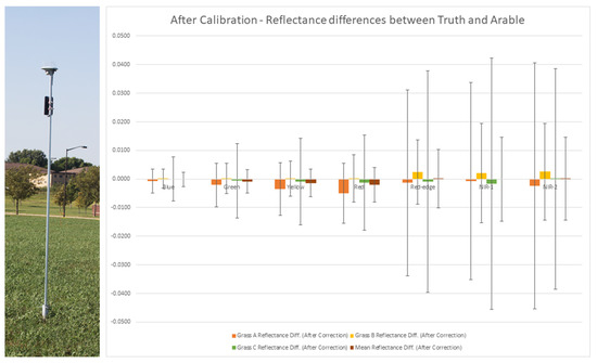 Arable (San Francisco, CA, USA) makes a low-cost field-deployable radiometer, known as the Arable Mark 2, primarily for agricultural applications. It has a multi-band downwelling and upwelling radiometer with set spectral filters covering the VNIR portion of the solar spectrum. This instrument is meant to be deployed throughout the agricultural growing season, is solar powered, and uploads data automatically via a cellular network interface. Details on the characterization and calibration of these units can be found in [31]. SDSU has used a number of these units over the past two years in an effort to evaluate their stability and accuracy for satellite calibration and validation [32]. Two units were deployed during BigMAC, as shown in Figure 2. The design of the large natural alfalfa target to border the Arable field of view allowed the efficient collection of data for ASD-based systems and Arables.