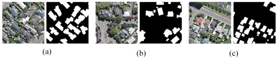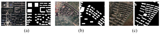Sample images from the WHU building dataset: (a–c) Original images (left) and corresponding labels (right).