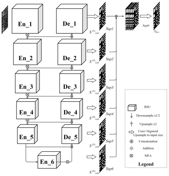 U2-Net utilizes a two-tiered nested U-shaped architecture. The primary layer features an extensive U-shaped framework comprising 11 stages, each incorporating a residual U-shaped block (RSU) as its secondary component. This layered U-shaped configuration is designed to enhance the efficient extraction of multiscale and hierarchical features. The overall, illustrated in Figure 4, is organized into three main sections: (1) the encoder, (2) the decoder, and (3) the map fusion block, which are further detailed below.