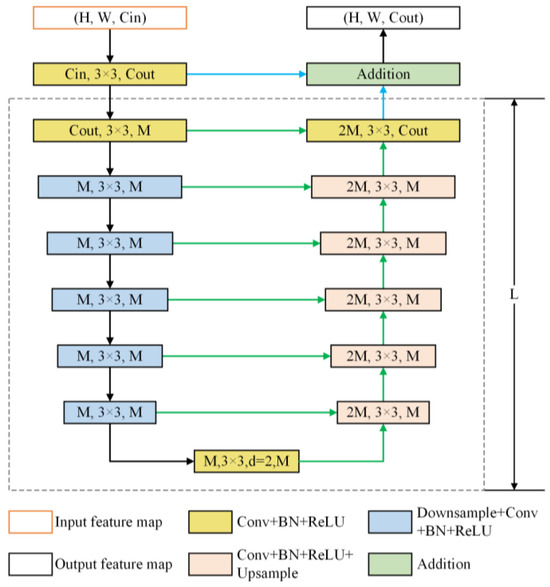 The U2-Net model integrates a deep architecture with strong multiscale capabilities while keeping computational and memory requirements low. Additionally, because U2-Net is made up exclusively of RSU blocks and does not depend on any pre-trained backbone, it provides significant flexibility. This allows it to be easily adjusted to various tasks with minimal loss in performance. Initially, the convolutional layer processes the input feature map , converting it into an intermediate map, , with channel . This layer is designed to capture local features. Then, a symmetric encoder–decoder with depth processes the intermediate feature map, , enabling the model to capture multiscale information and minimize the loss of contextual details during upsampling. Lastly, local and multiscale features are integrated through residual concatenation.