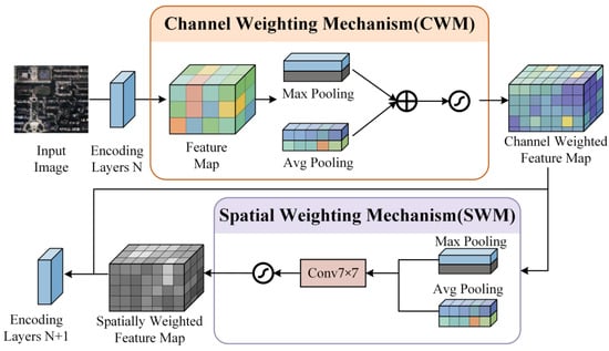 2. Spatial Weighting Mechanism: Next, the feature map enters the “Spatial Weighting Mechanism”, which aims to enhance the focus on more important spatial locations within the image. The Spatial Weighting Mechanism begins by applying pooling operations along the channel dimension, resulting in two separate pooled feature maps: one obtained through max pooling and the other through average pooling. These two pooled feature maps are concatenated along the channel dimension, then passed through a convolutional layer to generate a spatial attention map. This map indicates the significance of each spatial location within the feature map. The Sigmoid activation function is applied to this map, generating a weight coefficient. This coefficient is then element-wise multiplied with the channel-refined feature map, enabling the model to emphasize important spatial regions. The final output is a spatially weighted feature map that accentuates the most relevant areas for the task. The overall structure of the Channel Weighting Module (CWM) and the Spatial Weighting Module (SWM) is shown in Figure 6.