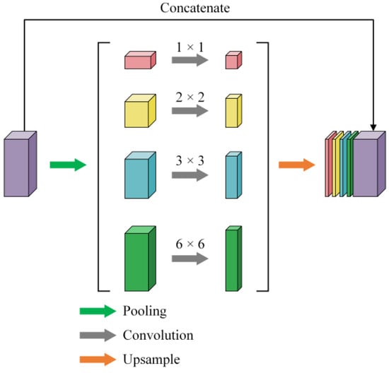 3. Multiscale Information Fusion Module: Finally, the feature map enters the “Multiscale Information Fusion Module” (MSIF), which enhances the model’s ability to capture global contextual information at multiple scales. The MSIF module employs adaptive average pooling at four scales (1 × 1, 2 × 2, 3 × 3, and 6 × 6) to capture hierarchical contextual patterns. Each pooled feature map is then processed by a 1 × 1 convolutional layer for channel reduction before upsampling. These pooled feature maps are passed through convolutional layers to adjust the number of channels, ensuring that each feature map, regardless of its scale, has a consistent channel count. Afterward, the pooled feature maps are upsampled using bilinear interpolation to match the spatial dimensions of the original input feature map. The upsampled feature maps are then concatenated along the channel dimension, producing a multiscale feature map that integrates contextual information from all scales. This process enables the model to extract and fuse global contextual information, improving its understanding of the image at different levels of detail. The overall structure of the MSIF module is shown in Figure 7.