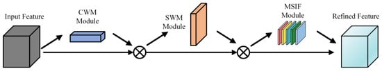 MFA differs from CBAM in three main aspects while offering notable advantages through the synergy among its three components. First, whereas CBAM applies a sequential channel-and-spatial attention approach, MFA incorporates an additional multiscale stage that captures localized features and broader contextual cues across multiple resolutions. By processing features through three stages, MFA filters out less informative channels, highlights critical spatial regions, and gathers multiscale information to handle objects or regions of varying sizes. Second, MFA is specifically integrated into an encoder–decoder architecture (U2-Net) to leverage multiscale downsampling and upsampling operations. In contrast, CBAM is typically inserted into standard classification backbones without explicitly aggregating context from different scales. Third, MFA merges channel, spatial, and multiscale cues in one unified pipeline, creating richer, more balanced input data for subsequent layers. In contrast, CBAM processes channel and spatial attention in sequence and does not have a dedicated multiscale component, potentially limiting its capacity to address large-scale variations. This three-stage synergy improves accuracy in local detail and offers global contextual awareness, ultimately enhancing the network’s reliability in diverse situations. Specifically, after the CWM refines channel importance, the SWM pinpoints which spatial regions are most relevant, and then the MSIF aggregates contextual clues from multiple scales. The result is a set of enhanced feature maps that enable more consistent decision-making, offering fine-grained accuracy and broader contextual understanding essential for complex vision tasks. The overall structure of the MFA module is shown in Figure 8.