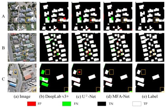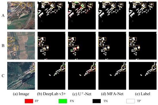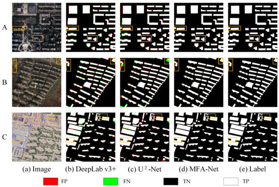 To further validate MFA-Net’s performance on diverse datasets, we tested it on the WHU Building dataset and compared the results with U2-Net. For a comprehensive comparison of all eight methods across the WHU Building dataset, including detailed regional performance analyses, see Figure A3 and Table A3 in Appendix A.
