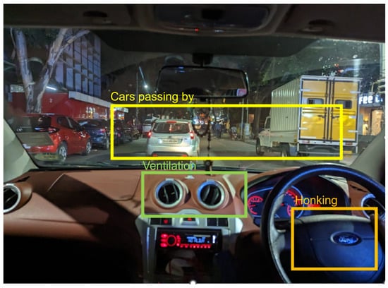 Example of an auditory scene that can be perceived inside a car. Inside, one can hear the sound of the ventilation, engine, honking, passing cars, etc. These can be identified as separate sound events that may overlap each other or may not overlap each other. The colored boxes on the figure represent some of these sources of sounds.