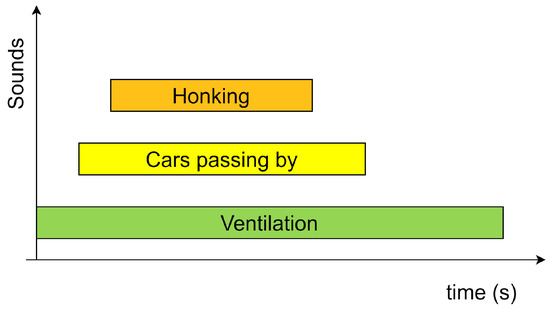 Acoustic Event Detection of the audio scene. The sound of ventilation, cars passing and honking, along with the onset and offset times of these events, are detected. The length of the rectangle is proportional to the duration of each sound and thus marks the start and end times. The rectangles are placed one above the other to indicate overlapping time intervals.