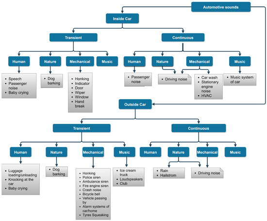 The first step in any sound event classification/detection task is to establish a context to collect audio data that reflect sounds in an automotive environment. Existing ontology, such as the one prescribed in the AudioSet dataset [15] covers a wide range of sound events. However, a deeper look into the ontology shows that they are more generic and do not cover some of the sounds that are exclusive to the automotive environment. For instance, the sound of wipers, indicators, HVAC, etc. Therefore, an ontology described in Figure 3 proposes a hierarchical categorization of different sounds that originate in an automotive environment. The ‘Urbansound Dataset 8K’, which derived the taxonomy for urban sounds, defined the four top-level groups for sound sources as human, nature, mechanical and music [18]. Similar top-level groups can also be applied in this case. Note that the ontology is a work in progress and can be reformulated later by adding or removing events.