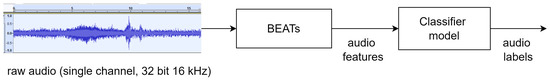 Figure 4 summarizes the approach proposed for the AED system using the pre-trained network BEATs [20]. Single channel, 32-bit audio with a sampling rate equal to 16 kHZ is fed to the BEATs representation network, which will extract features of the input audio (refer to Section 2.5). These audio features are fed to the downstream classifier model, which represents the additional layers on which the target domain data are trained. Due to the high complexity of the BEATs model, its model parameters can be kept frozen. This means that during training, only the parameters of the classifier model will be updated to perform multilabel classification. Thus, BEATs acts as a frozen feature extractor while the classifier model is trained on these features to predict the corresponding labels.