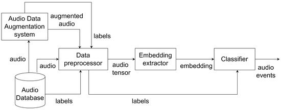 Overview of AED system. The audio data from the Audio Database are fed to the Audio Data Augmentation system for data augmentation. Data preprocessor converts the input audio along with the augmented audio into the tensor format [25] to convert them into embeddings by the embedding extractor. The Classifier model is trained using these embeddings and the corresponding labels.
