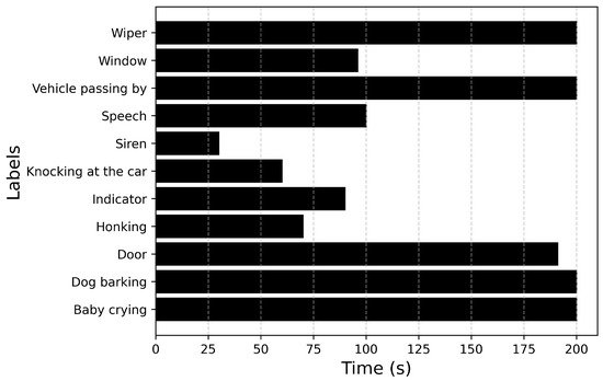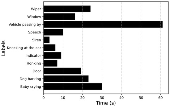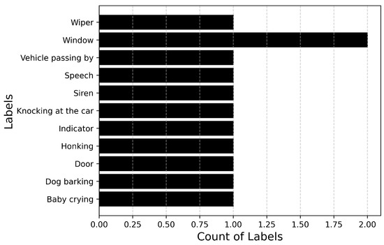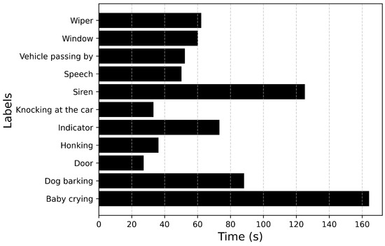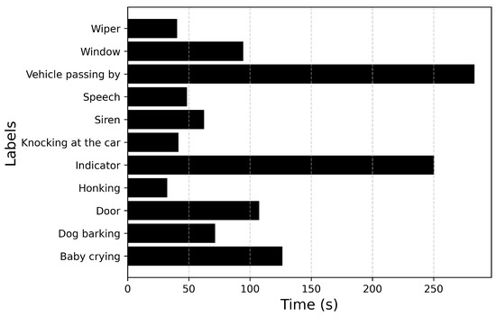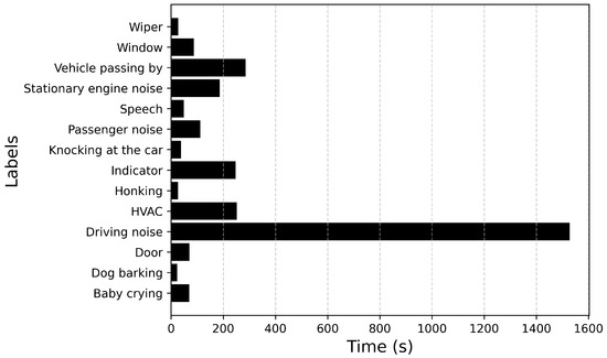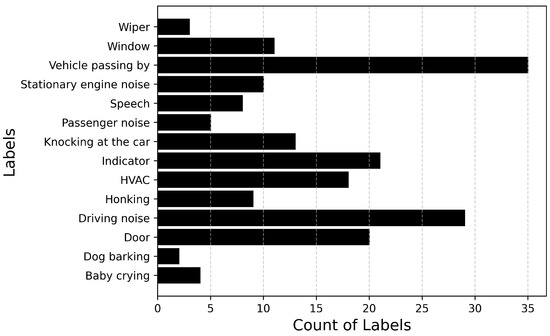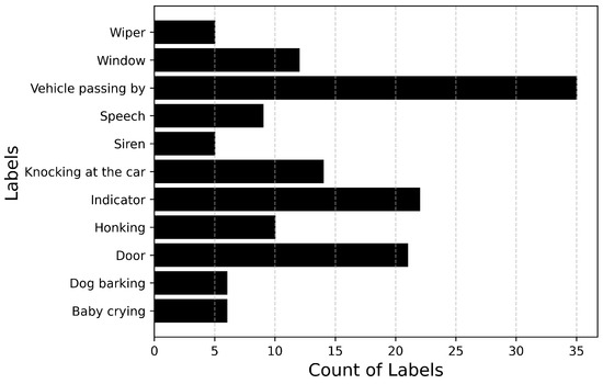Figure 6 and Figure 7 describe the audio database containing recordings of 14 events totaling up to 71 min of audio data. Figure 6 plots the number of audio recordings for each label. It must be noted that these recordings contain only the annotated label and there is no overlapping of events. It can be inferred from the figure that the dataset is heavily imbalanced with a large number of samples available for events such as Driving noise and Vehicle passing by while only a few samples are available for events such as Baby crying and Wiper. If the imbalance value is defined as the highest number of samples (Vehicle passing by: 35) to the lowest number of samples (Dog barking: 2), then the imbalance ratio of this dataset will be 17.5.