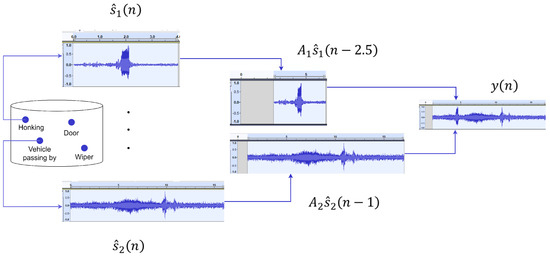 Augmentation overview. The labels ‘Honking’ and ‘Vehicle passing by’ are selected from the database. The normalized signals are scaled by a random value in the range [0, 1] with the start of the signals time shifted by values chosen randomly from the user-specified range for each signal. The final augmented audio y(n) contains the sound of vehicles passing by and honking with the applied time shifts and amplitude scaling.